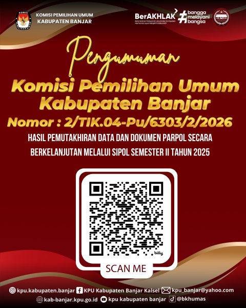 Pengumuman hasil pemutakhiran data dan dokumen Partai Politik secara berkelanjutan melalui Sipol Semeseter II Tahun 2025 tingkat Kabupaten Banjar dapat diunduh disini. ....