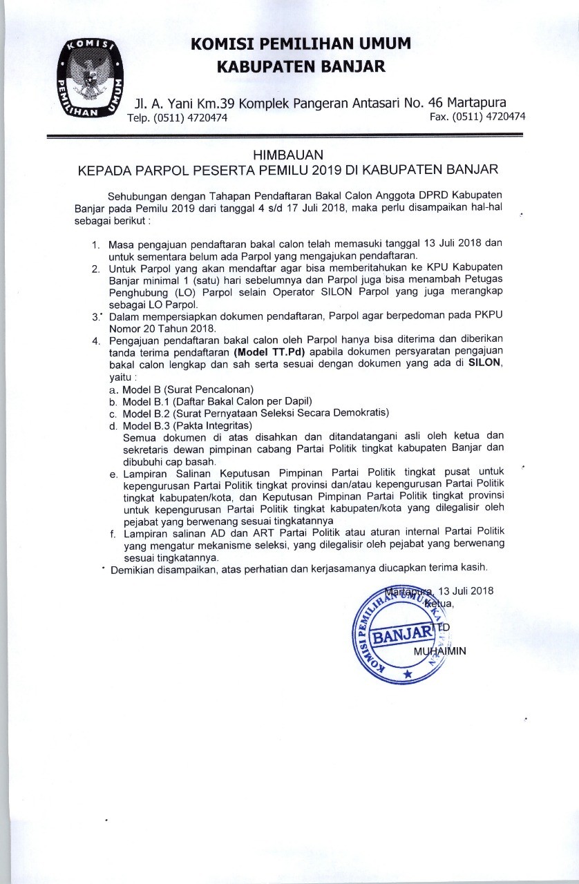 Sehubungan dengan Tahapan Pendaftaran bakal calon Anggota DPRD Kabupaten Banjar pada Pemilu 2019 dari tanggal 4 s/d 17 juli 2018, maka perlu disampaikan hal-hal sebagai berikut :