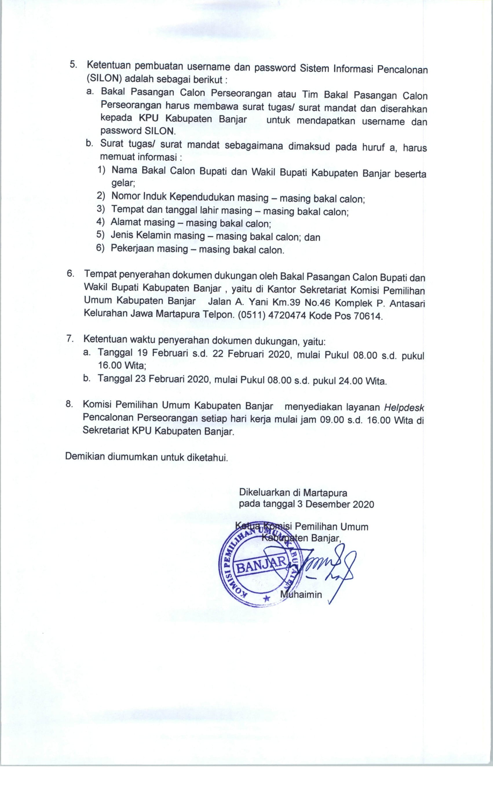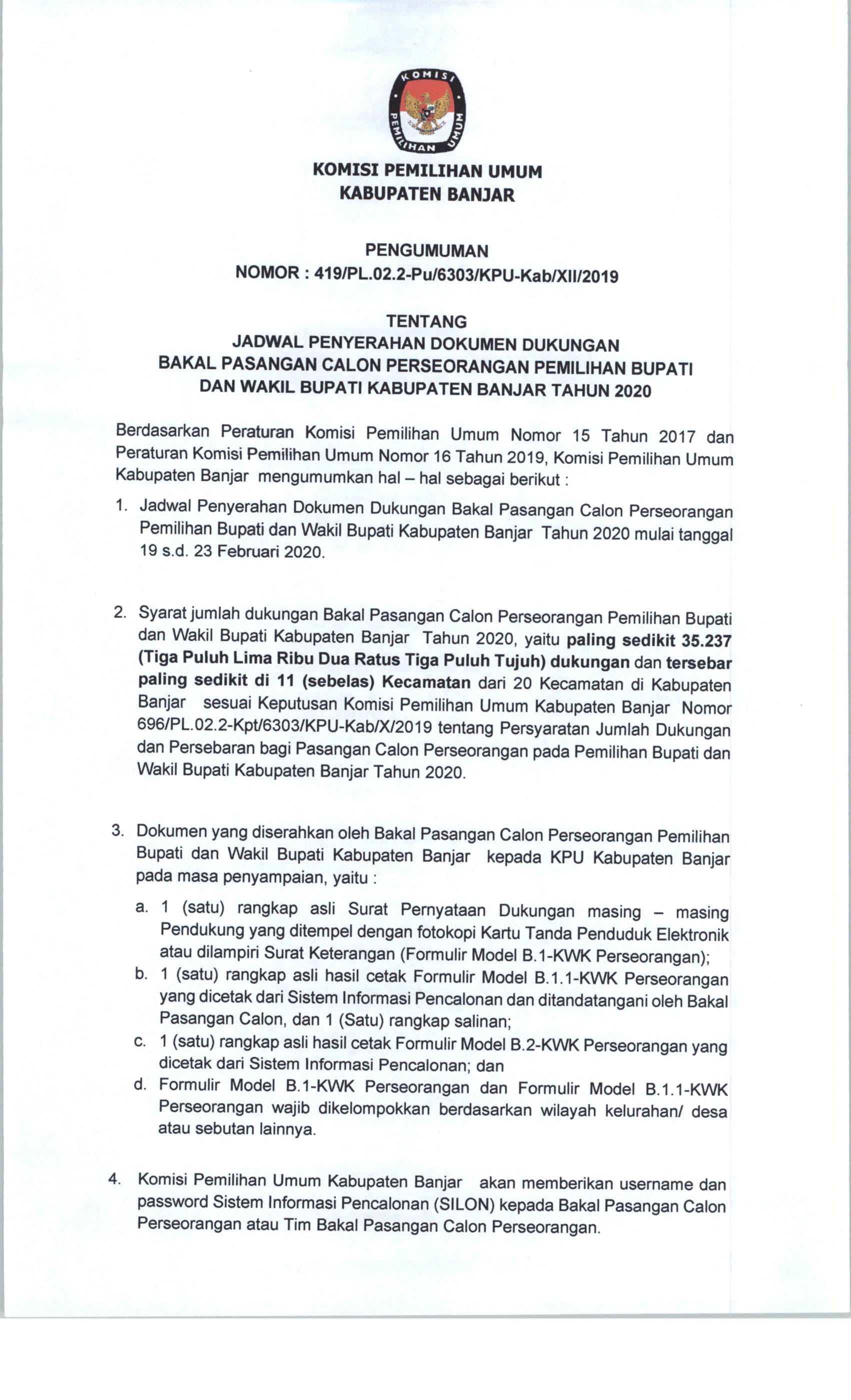 JADWAL PENYERAHAN DOKUMEN BAKAL CALON PERSEORANGAN PEMILIHAN BUPATI DAN WAKIL BUPATI KABUPATEN BANJAR TAHUN 2020