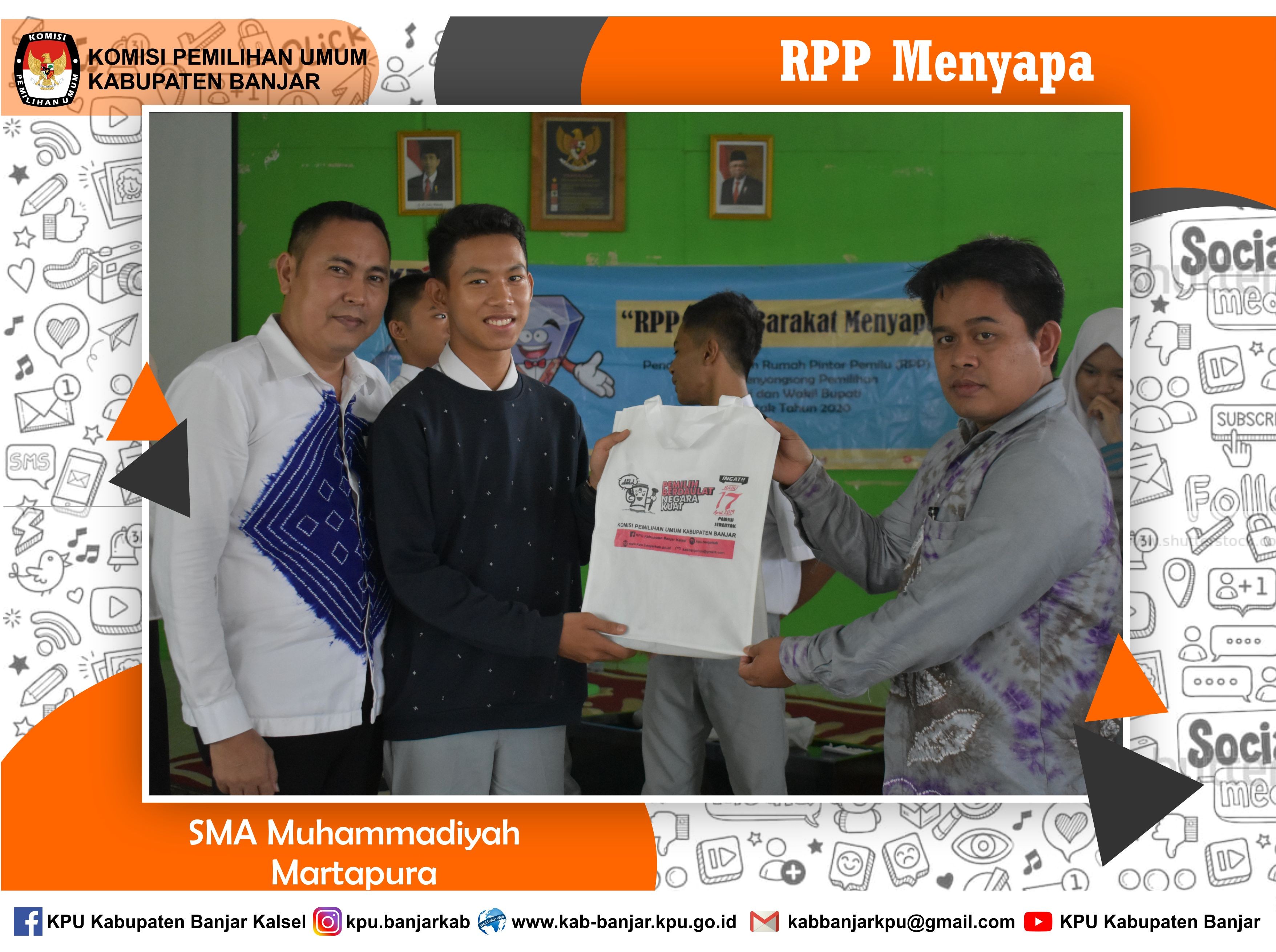 Rabu, 4 Desember 2019 RPP KPU Banjar Menyapa kembali melakukan kegiatan sosialisasi pendidikan pemilih di SMA Muhammadiyah Martapura. Materi dibawakan oleh Ibu Muslihah selaku Komisioner Divisi Perencanaan Data dan Informasi. Beliau menyampaikan materi tentang sejarah kepemiluan, tahapan kepemiluan dan lain-lain. di penghujung acara pesera yang mendapatkan nilai pretest tertinggi mendapatkan suvenir dari KPU Kabupaten Banjar. tidak lupa juga KPU Kabupaten Banjar menyerahkan suvenir, pamflet, buku RPP serta brosur kepemiluan kepada SMA Muhammadiyah Martapura. Acara ditutup dengan foto bersama.