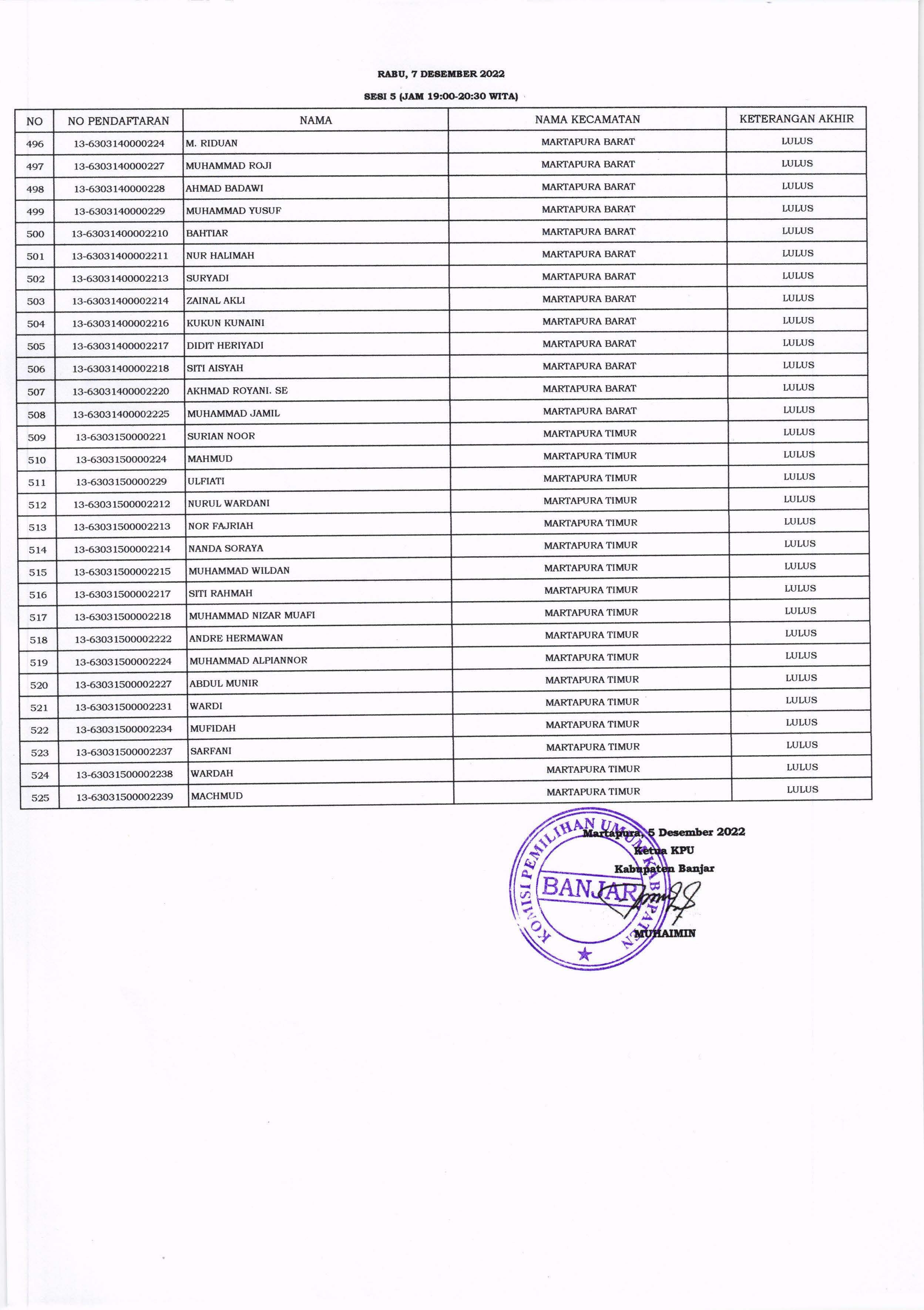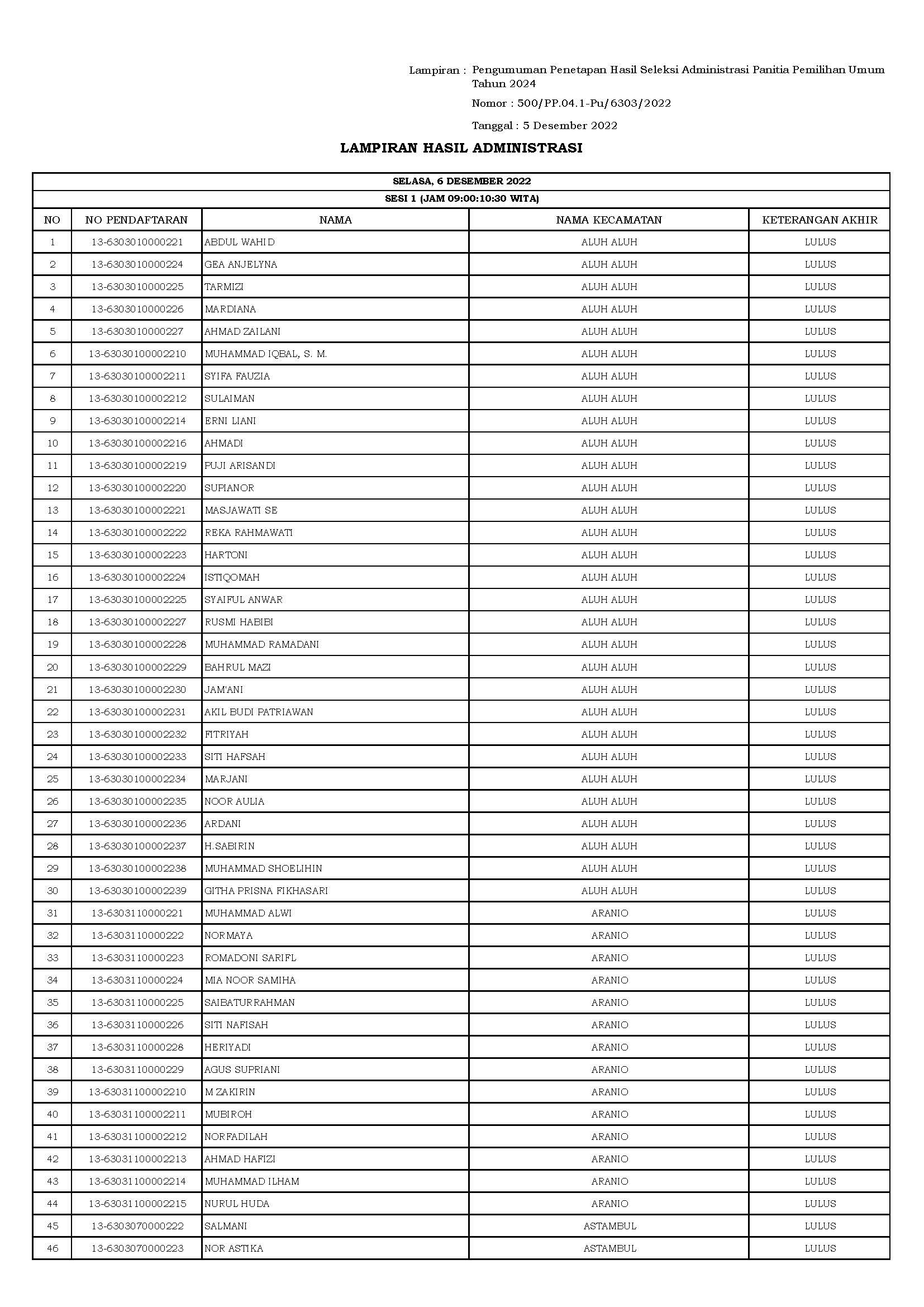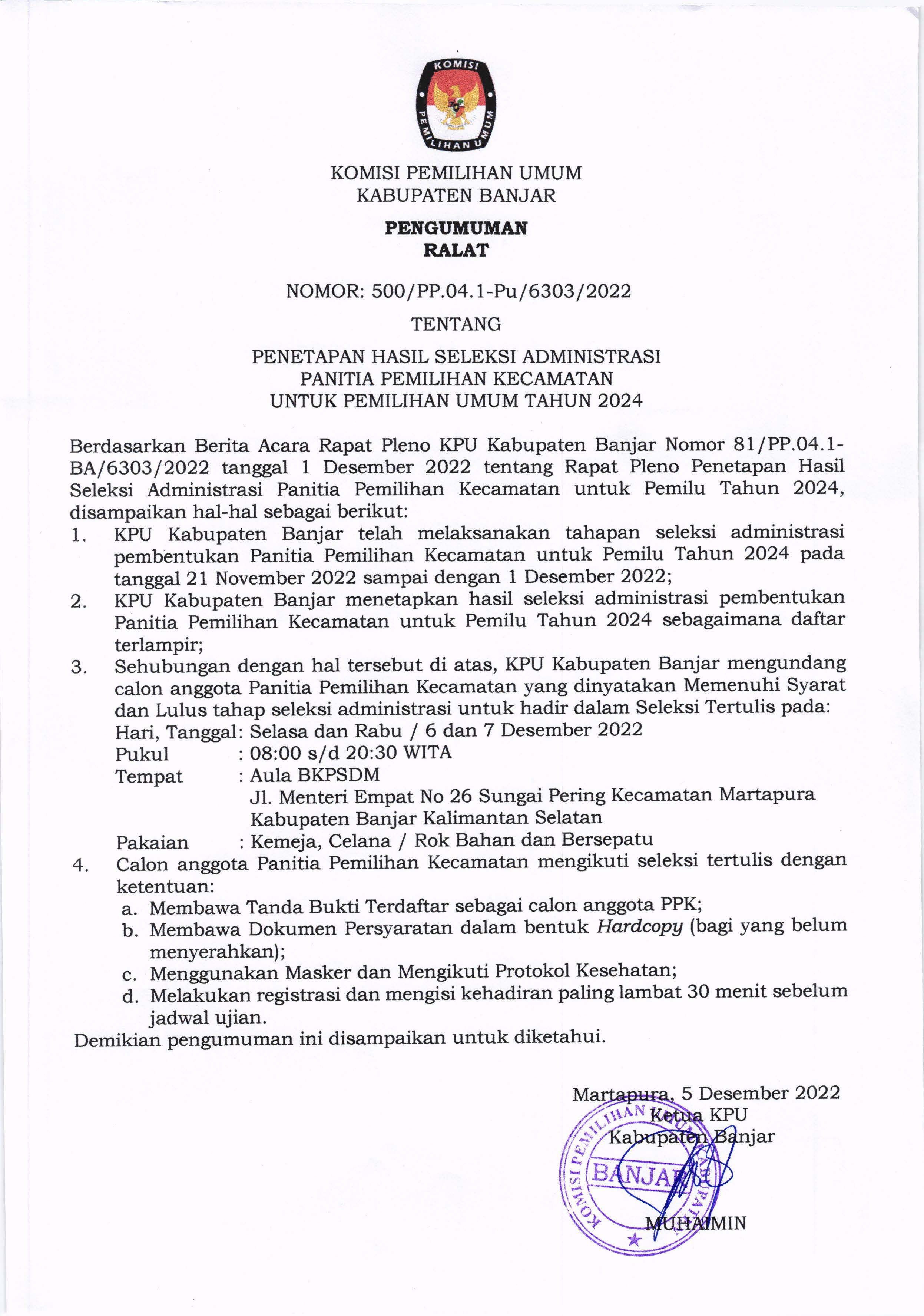 PENETAPAN HASIL SELEKSI ADMINISTRASI PANITIA PEMILIHAN KECAMATAN UNTUK PEMILIHAN UMUM TAHUN 2024