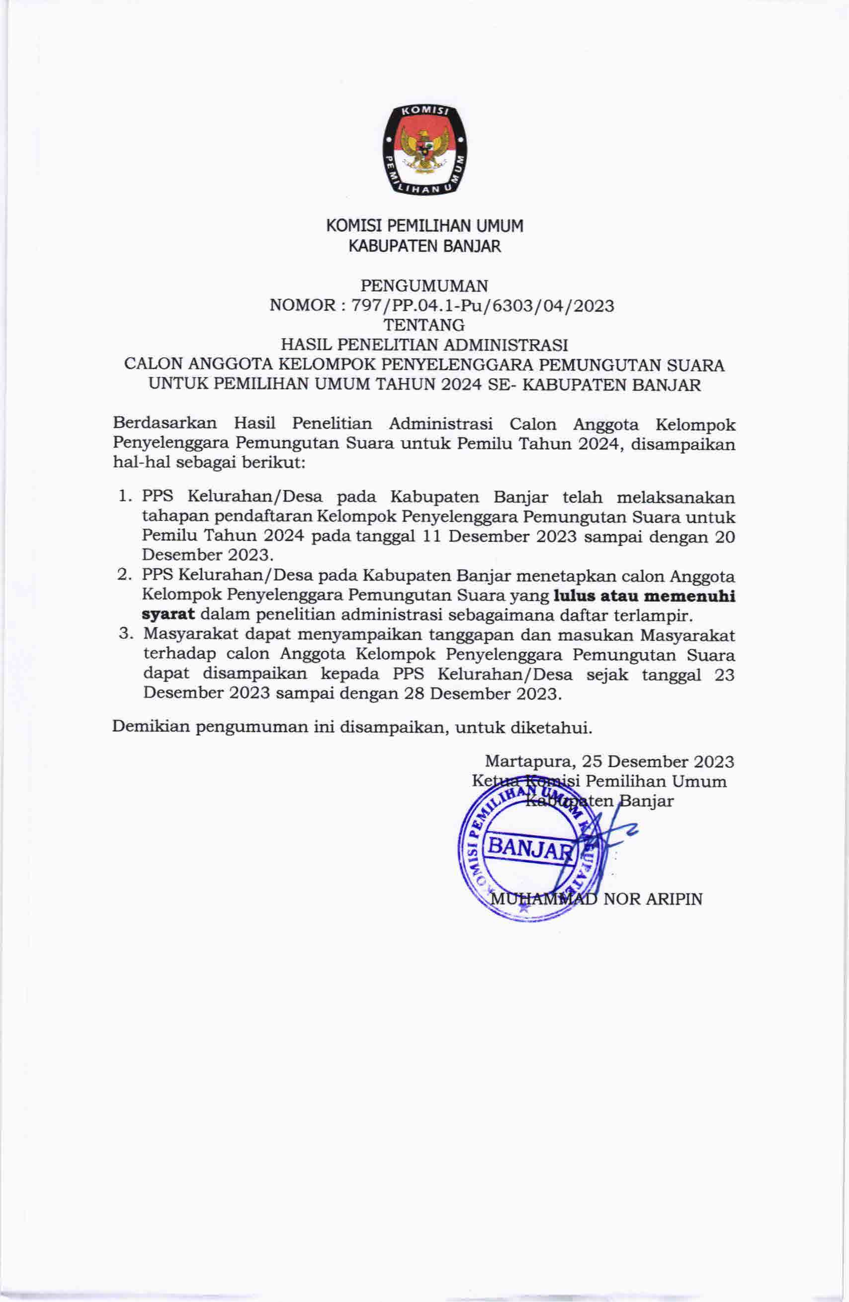 PENGUMUMAN HASIL PENELITIAN ADMINISTRASI CALON ANGGOTA KELOMPOK PENYELENGGARA PEMUNGUTAN SUARA UNTUK PEMILIHAN UMUM TAHUN 2024 Senin, 25 Desember 2023 23:18 846 DOWNLOAD PENGUMUMAN DISINI Bagikan: Telah dilihat 846 kali