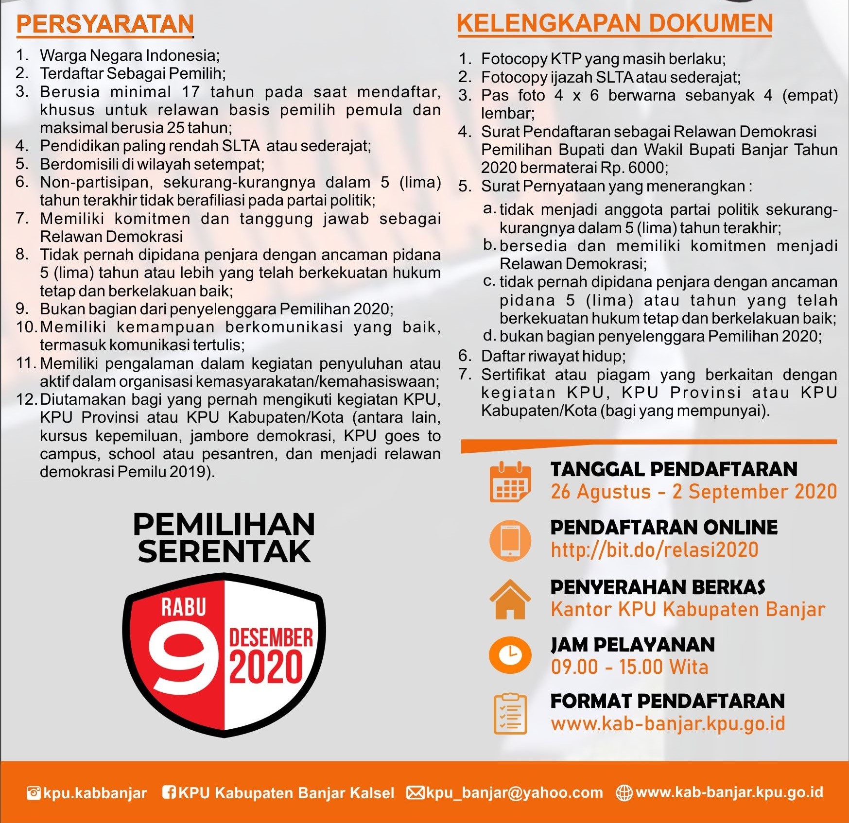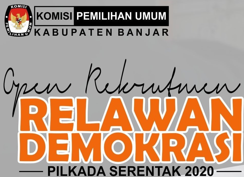 Komisi Pemilihan Umum Kabupaten Banjar menyampaikan kepada masyarakat Kabupaten Banjar untuk bergabung dalam program Relawan Demokrasi 2020. Pengumuman lengkap dan formulir pendaftarannya dapat diunduh di link berikut :