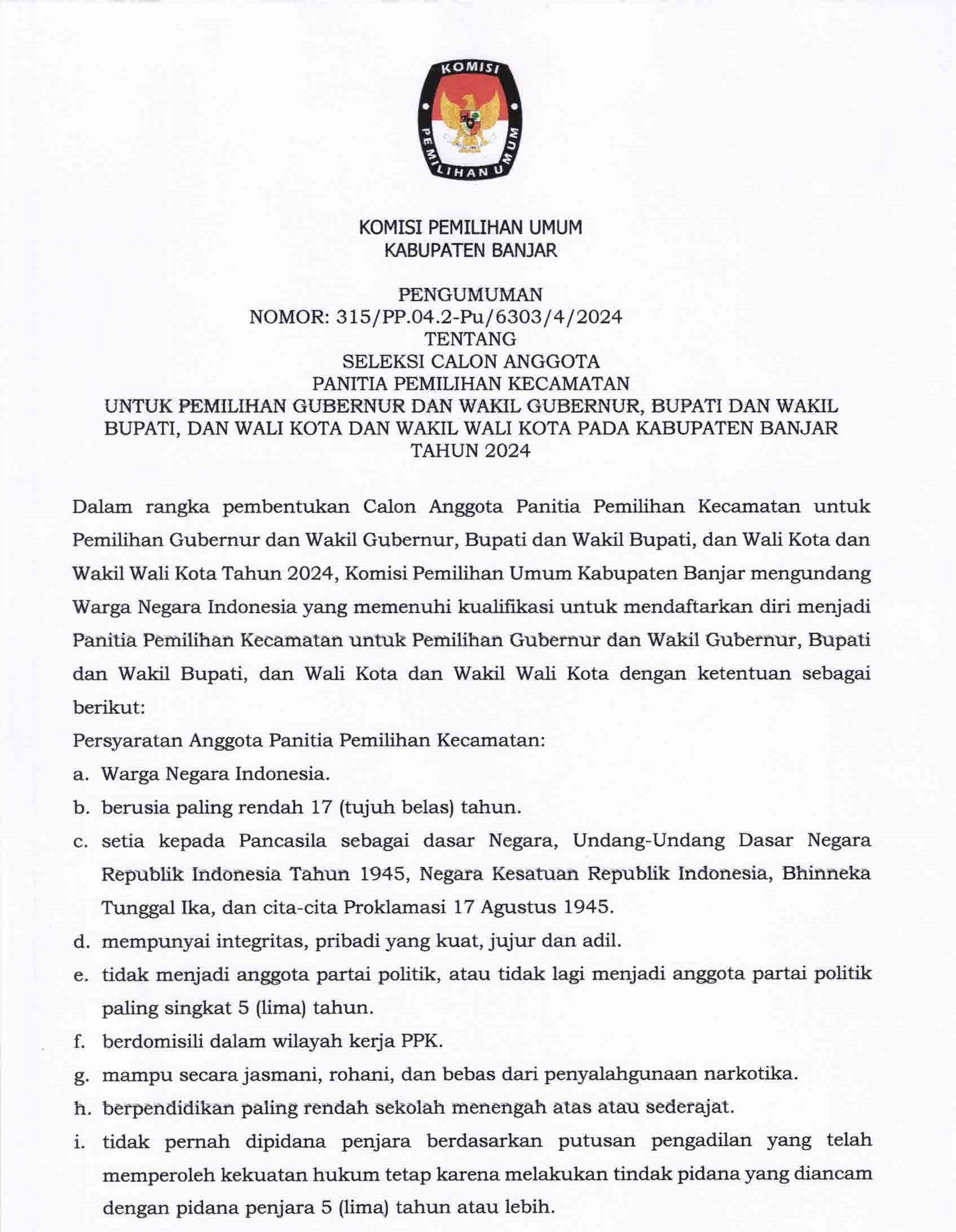PENGUMUMAN PENDAFTARAN SEBAGAI CALON ANGGOTA PPK KABUPATEN BANJAR UNTUK UNTUK PEMILIHAN GUBERNUR DAN WAKIL GUBERNUR, BUPATI DAN WAKIL BUPATI, PADA KABUPATEN BANJAR TAHUN 2024 Selasa, 23 April 2024 13:56 772 DOWNLOAD PENGUMUMAN & LAMPIRAN DISINI Bagikan: Telah dilihat 772 kali
