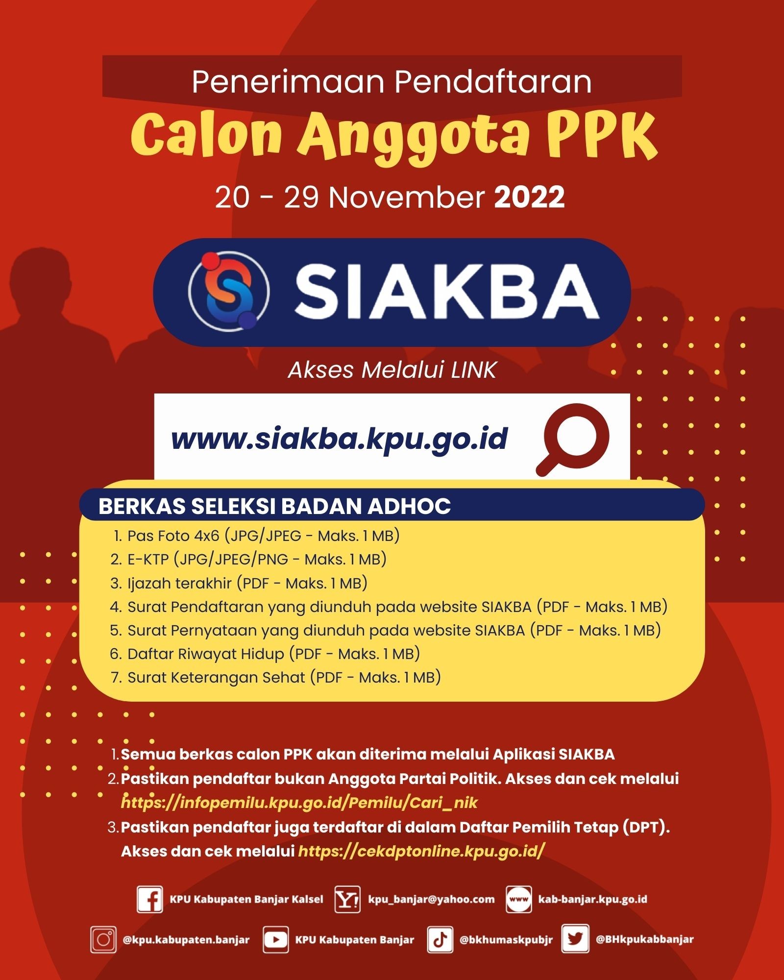 Dalam rangka pembentukan Panitia Pemilihan Kecamatan untuk Pemilihan Umum, Komisi Pemilihan Umum Kabupaten Banjar mengundang Warga Negara Indonesia yang memenuhi persyaratan untuk mendaftarkan diri menjadi anggota Panitia Pemilihan Kecamatan untuk Pemilihan Umum dengan ketentuan sebagai berikut: