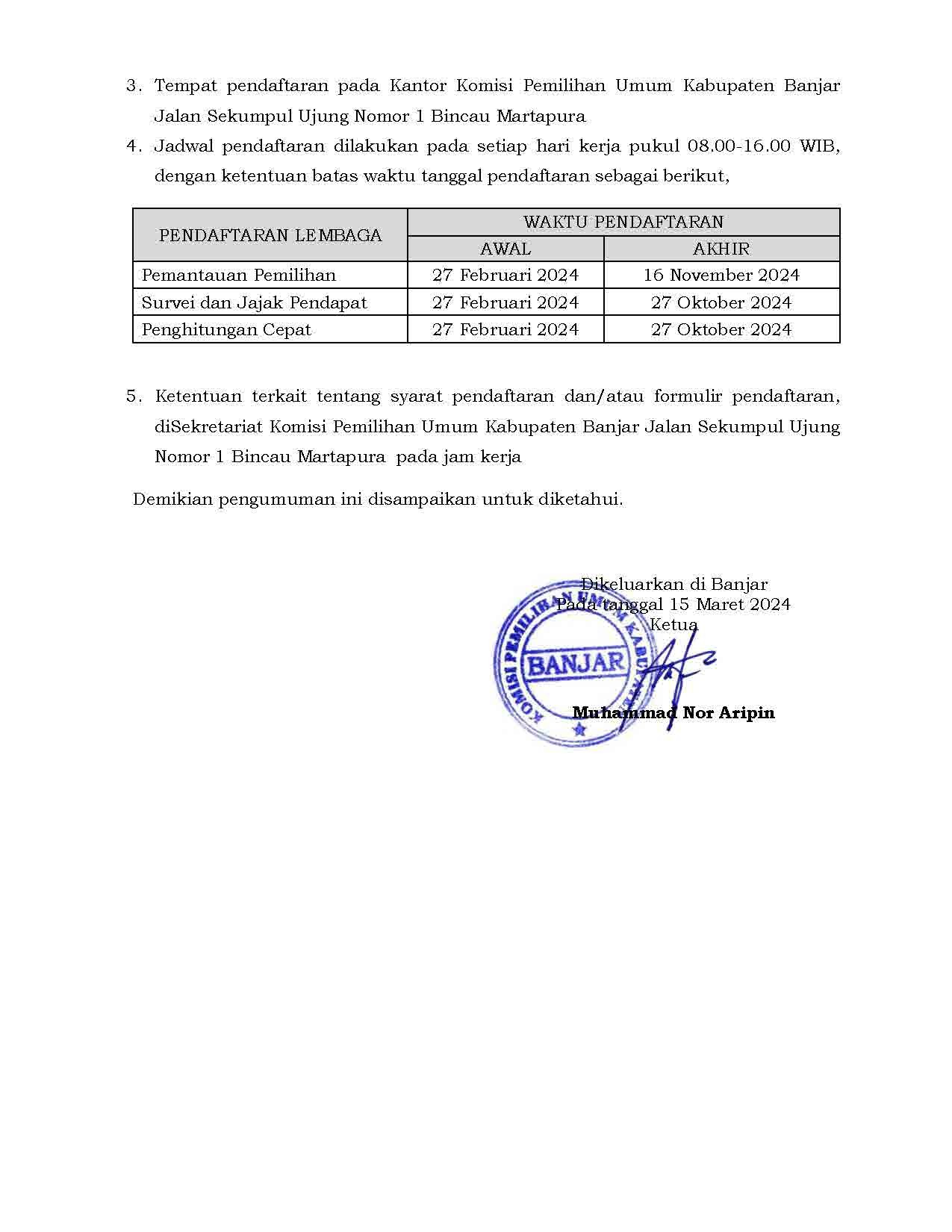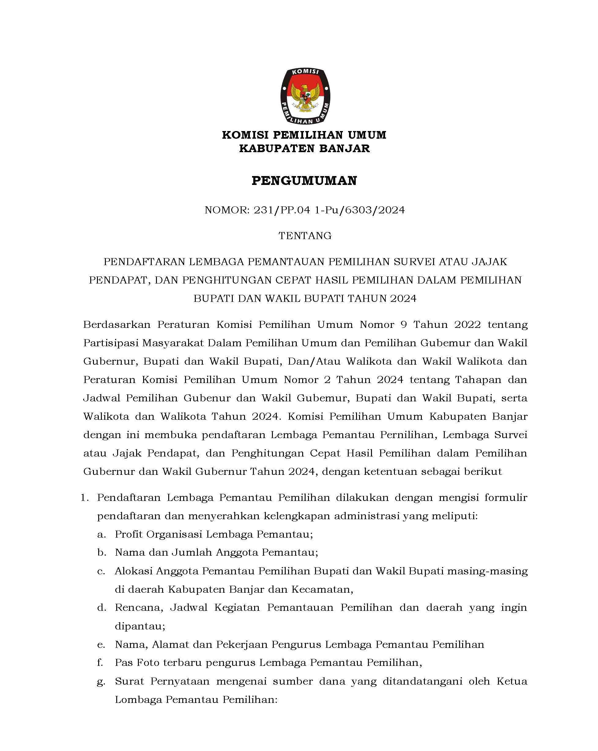PENGUMUMAN TENTANG PENDAFTARAN LEMBAGA PEMANTAUAN PEMILIHAN SURVEI Minggu, 17 Maret 2024 16:37 371 DOWNLOAD PENGUMUMAN DISINI Bagikan: Telah dilihat 371 kali