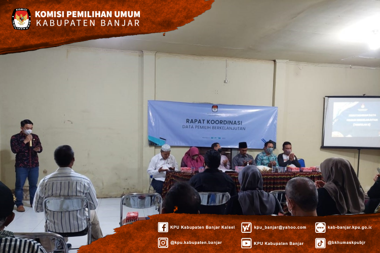 Komisi Pemilihan Umum (KPU) Kabupaten Banjar menggelar Rapat Koordinasi Daftar Pemilih Berkelanjutan (DPB) Periode Bulan Juni dan Triwulan II Tahun 2022 di Kantor yang baru Ruangan Media Center KPU Kabupaten Banjar beralamat Komplek Perkantoran Kecamatan Martapura Kota Jl.Sekumpul Ujung No.1, Jum’at (24/06/2022). Rapat Koordinasi dihadiri Ketua KPU Kabupaten Banjar Muhaimin, S.Ag. dan Anggota KPU Kabupaten Banjar Divisi Perencanaan Data dan Informasi Muslihah, Divisi Sosialisasi,Pendidikan Pemilih,Partisipasi Masyarakat, dan Sumber Daya Manusia Abdul Muthalib, Divisi Teknis Penyelenggara Muhammad Zain dan Divisi Hukum dan Pengawasan Husni Tamrin. Sekretariat KPU Kabupaten Banjar Dihadiri Sekretaris Mashuriansyah,Kasubbag Program dan Data H. Masagoes Achmad Zulkifli, Kasubbag Umum,Keuangan dan Logistik Ratih Pandan Sari, Kasubbag Teknis,Penyelenggaraan Pemilu,Partisipasi dan Hubungan Masyarakat Denny Agus Fitriansyah dan Kasubbag Hukum dan SDM Karina Widyatika dan staf Sekretariat Rika Widyanti dan Rizayunisa serta Operator Adam Rizky. Rakor ini juga dihadiri Bawaslu Kabupaten Banjar ,Disdukcapil,Kepolisian resor Banjar,Dinas Pendidikan Provinsi Kalsel,Pengadilan Negeri Martapura,Kodim 1006,Kesbangpol,Kementrian Agama Kabupaten Banjar,Kepala Lapas Anak 1 Martapura,Kepala Lapas Perempuan Kelas II A Martapura,Kepala lapas Narkotika Kelas II A Karang Intan,Kepala BPMD dan Perwakilan 16 Partai Politik .