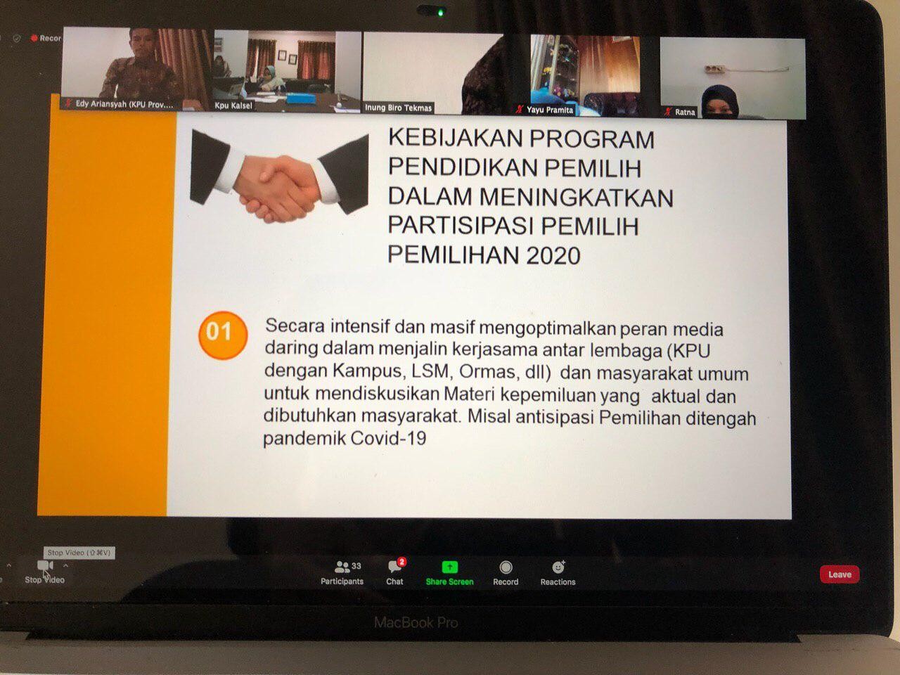 Hari ini, Selasa (19/5) KPU Provinsi Kalimantan Selatan menyelenggarakan Rapat Koordinasi secara virtual dalam rangka penguatan sosialisasi, pendidikan pemilih dan partisipasi masyarakat dalam Pilkada.