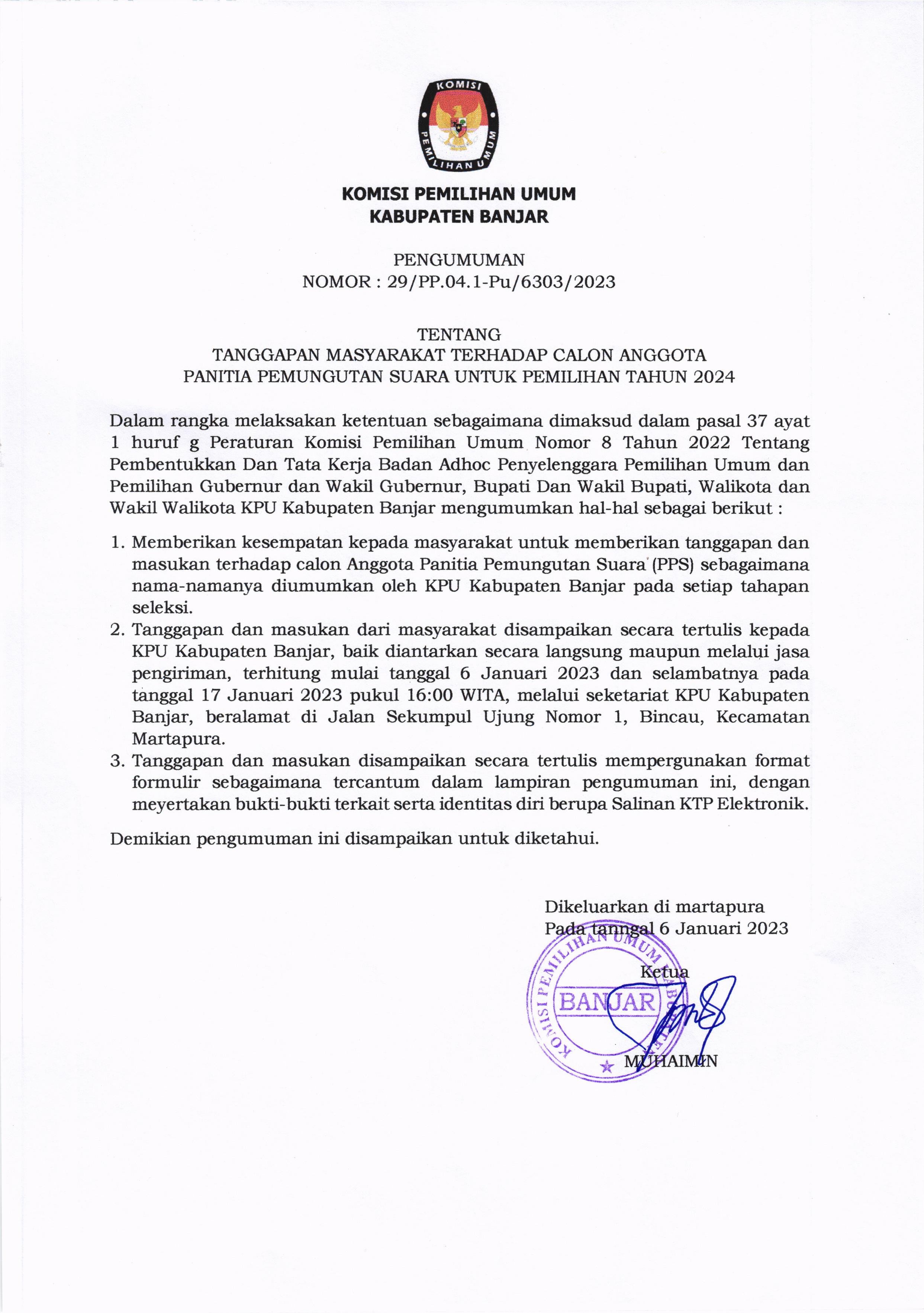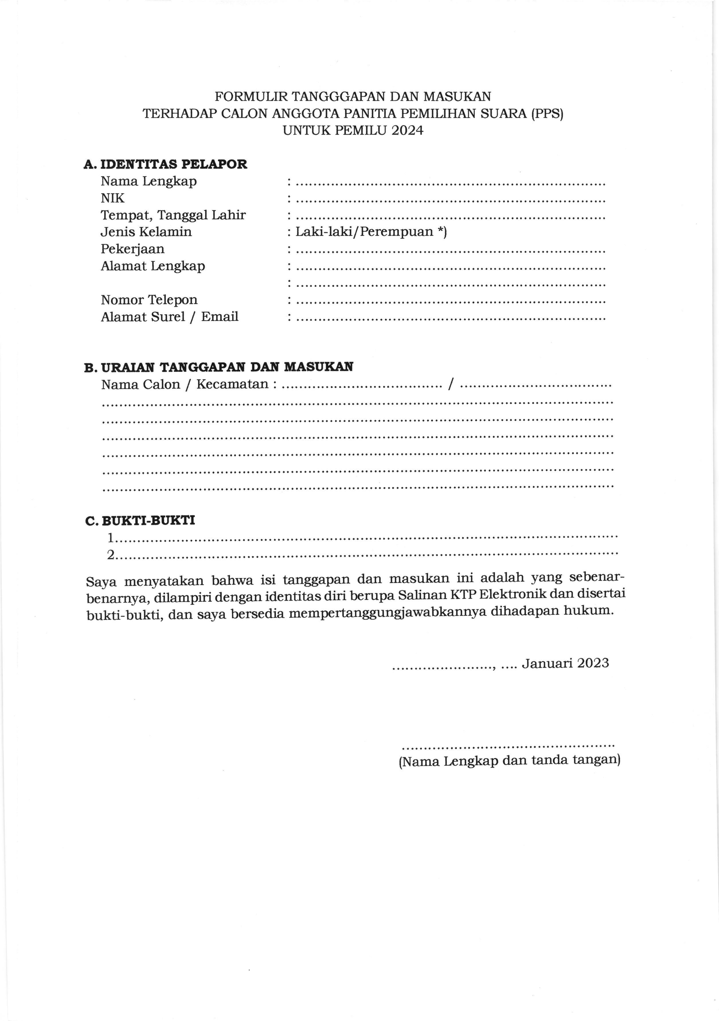 TENTANG TANGGAPAN MASYARAKAT TERHADAP CALON ANGGOTA PANITIA PEMUNGUTAN SUARA UNTUK PEMILIHAN TAHUN 2024 Jumat, 06 Januari 2023 22:09 926 Download Formulir Bagikan: Telah dilihat 926 kali