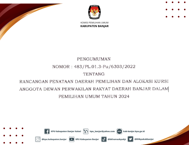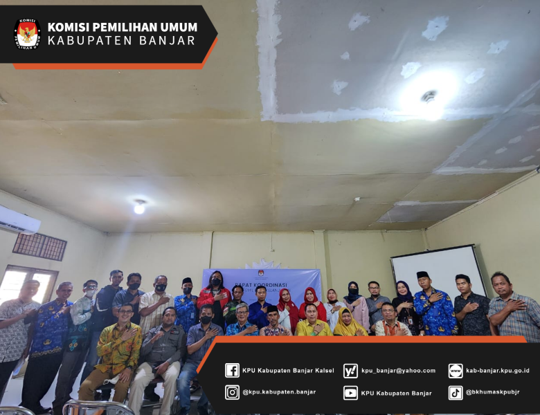 Komisi Pemilihan Umum (KPU) Kabupaten Banjar menggelar Rapat Koordinasi Daftar Pemilih Berkelanjutan (DPB) Tahun 2022 Periode Bulan September dan Triwulan III di Aula Kabupaten Banjar, Sabtu (01/10/2022). Rapat Koordinasi dihadiri Ketua KPU Kabupaten Banjar Muhaimin, S.Ag. dan Anggota KPU Kabupaten Banjar Divisi Perencanaan Data dan Informasi Muslihah, Divisi Sosialisasi,Pendidikan Pemilih,Partisipasi Masyarakat, dan Sumber Daya Manusia Abdul Muthalib, Divisi Hukum dan Pengawasan Husni Tamrin,Divisi Teknis Penyelenggaraan Muhammad Zain, Sekretariat KPU Kabupaten Banjar dihadiri Sekretaris, Kasubbag, Staf dan PPNPM , Bawaslu Kabupaten Banjar, Polres Banjar, Kodim 1006, Kesbangpol, Lapas Anak 1 Martapura, Lapas Narkotika Kelas II A Karang Intan, BPMD, Gerindra, PDIP , Golkar, PKS, Perindo, PPP, PSI, PAN, Hanura, Demokrat, PBB,PKP.