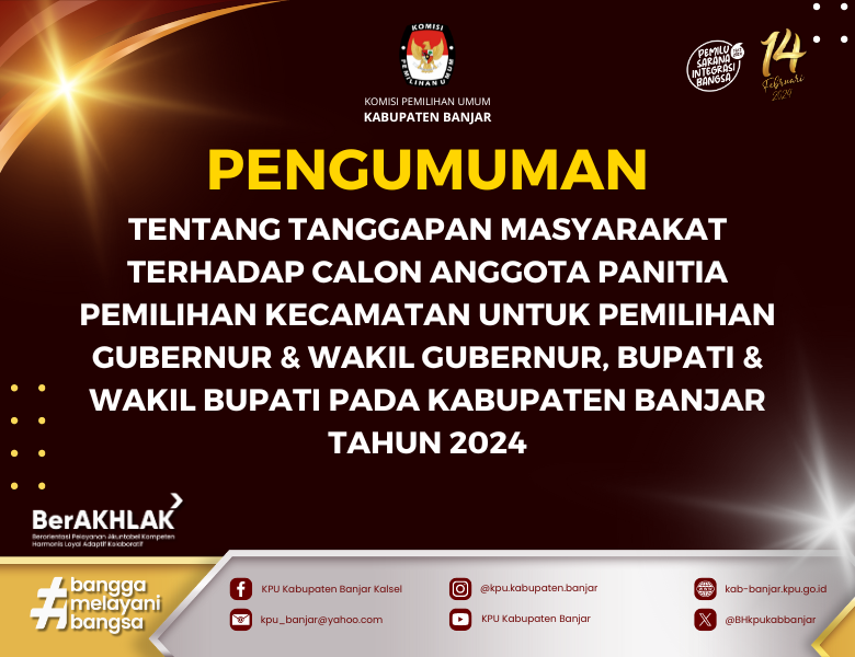Informasi lebih lanjut tentang ketentuan Pengajuan Bakal Calon Anggota DPRD Kabupaten Banjar dapat diperoleh di Kantor Komisi Pemilihan Umum Kabupaten Banjar Jl. A. Yani Km. 39 No.46 KOMPAS Martapura atau menghubungi No. HP. 0852 51224259 (Riza) dan No. HP. 0813 49382048 (Huri).