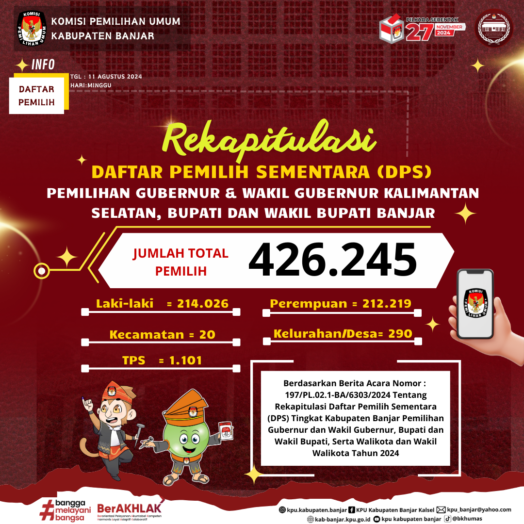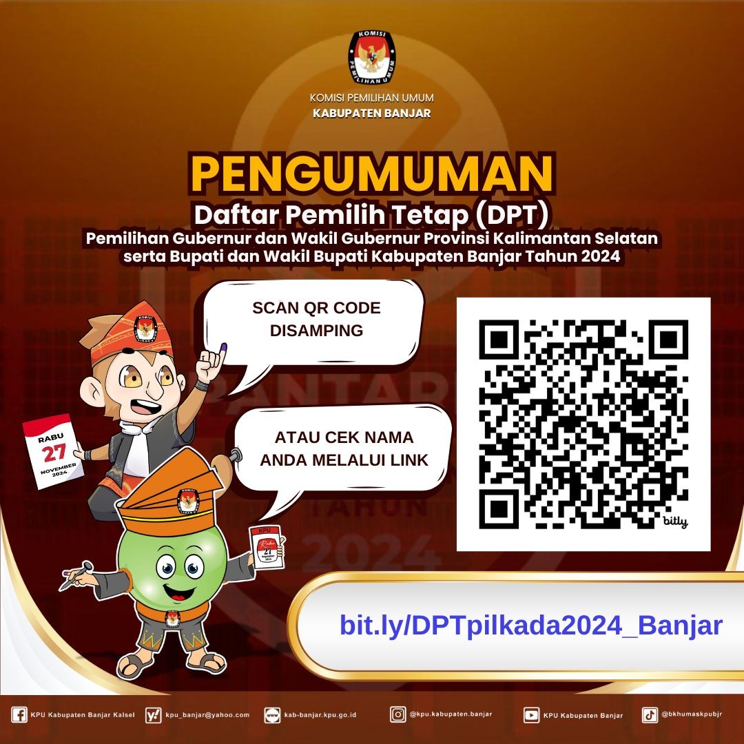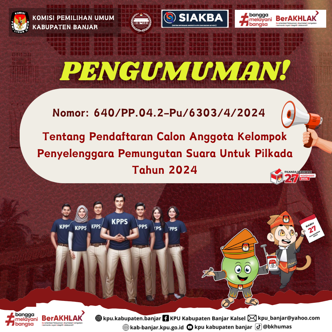Bahwa untuk melaksanakan ketentuan Pasal 95 ayat (1) Peraturan KPU Nomor 8 Tahun 2024 tentang Pencalonan Gubernur dan Wakil Gubernur, Bupati dan Wakil Bupati, serta Walikota dan Wakil Walikota, Komisi Pemilihan Umum Kabupaten Banjar mengumumkan Pendaftaran Pasangan Calon Bupati dan Wakil Bupati Kabupaten Banjar Tahun 2024 sebagai berikut: 1. Berdasarkan Keputusan KPU Kabupaten Banjar Nomor 1215 Tahun 2024 mengenai Penetapan Syarat Minimal Suara Sah Partai Politik atau Gabungan Partai Politik Peserta Pemilihan Umum Tahun 2024 untuk Mengajukan Pasangan Calon Pada Pemilihan Bupati dan Wakil Bupati Kabupaten Banjar Tahun 2024 menyatakan syarat minimal suara sah 27.139 (dua puluh tujuh ribu seratus tiga puluh sembilan) 2. Waktu dan Tempat Pendaftaran Pasangan Calon Bupati dan Wakil Bupati sebagai berikut: a. hari/tanggal : Selasa, 27 Agustus 2024 s.d Rabu, 28 Agustus 2024 waktu : Pukul 08.00 s.d Pukul 16.00 WITA b. hari/tanggal : Kamis, 29 Agustus 2024