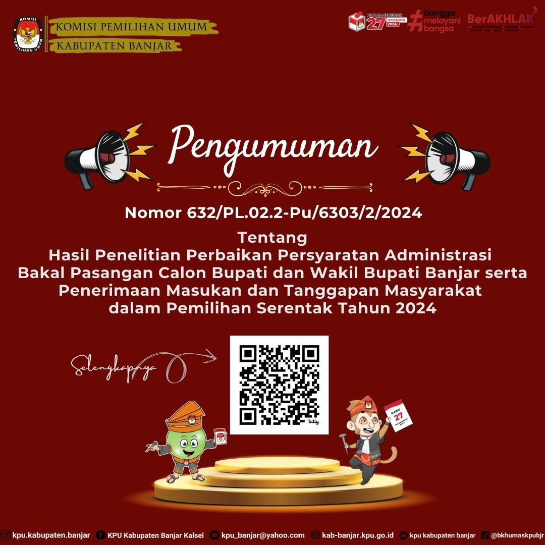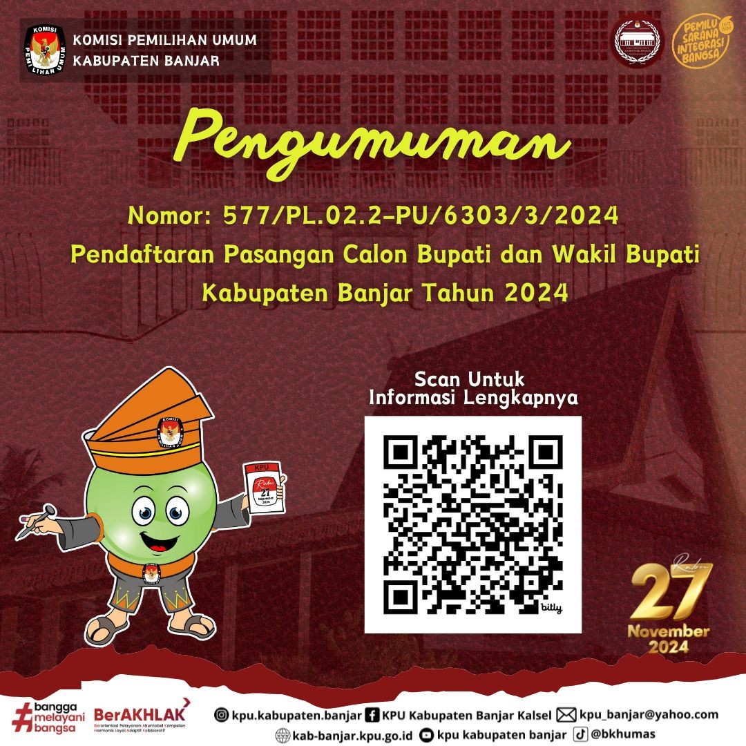 KOMISI PEMILIHAN UMUM KABUPATEN BANJAR PENGUMUMAN NOMOR : 577/PL.02.2-Pu/6303/3/2024 TENTANG PENDAFTARAN PASANGAN CALON BUPATI DAN WAKIL BUPATI KABUPATEN BANJAR TAHUN 2024