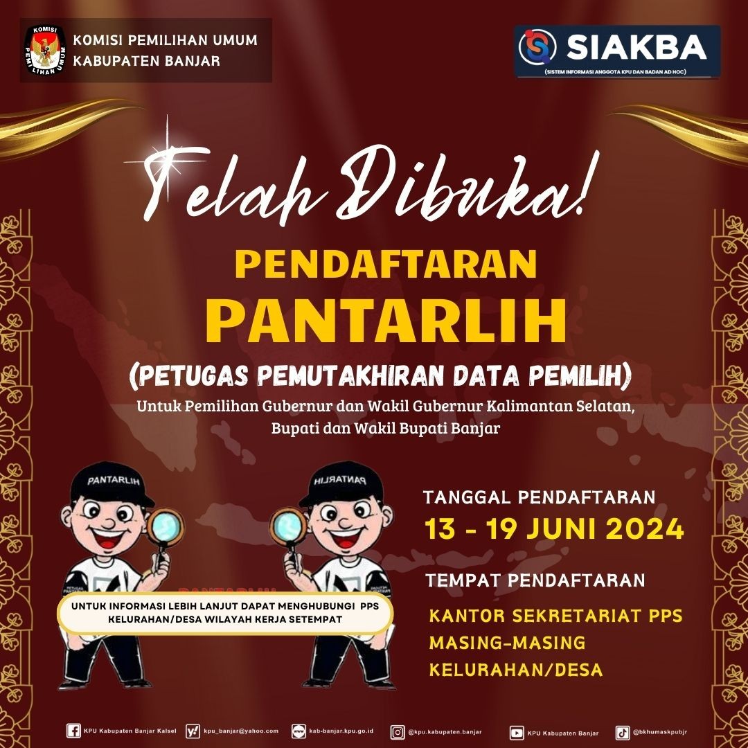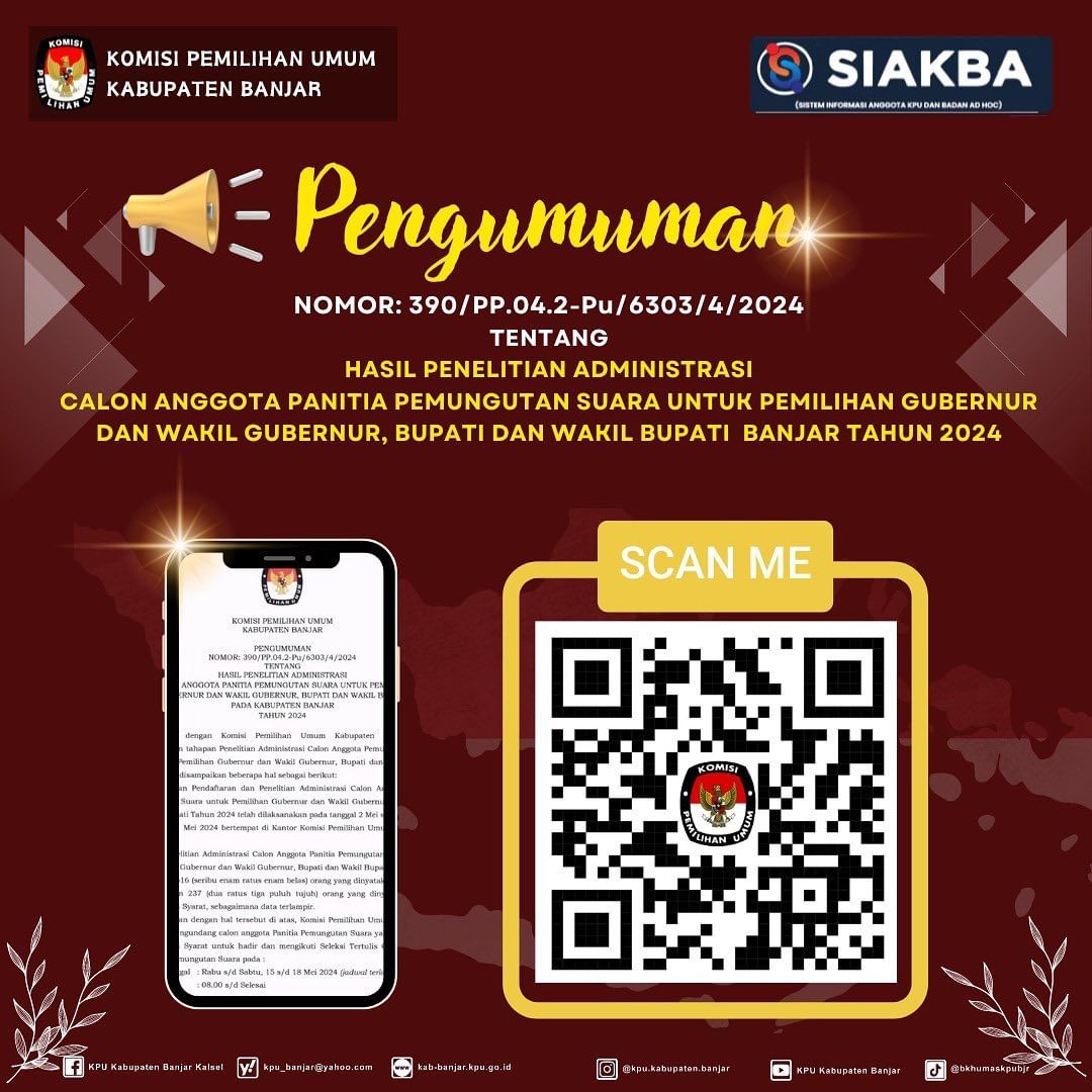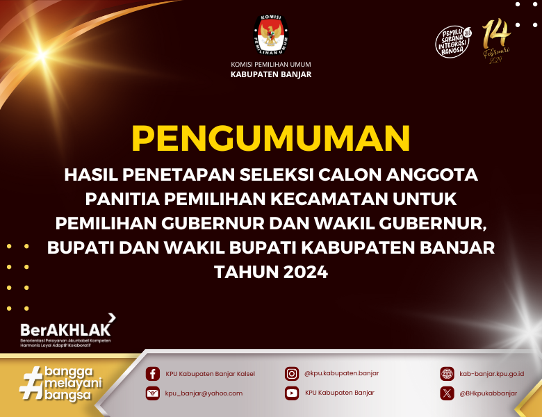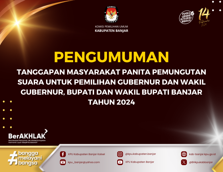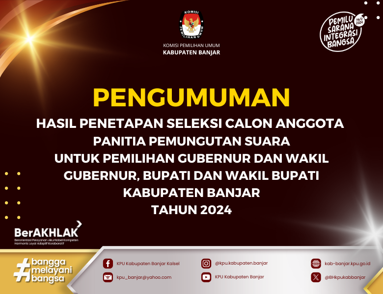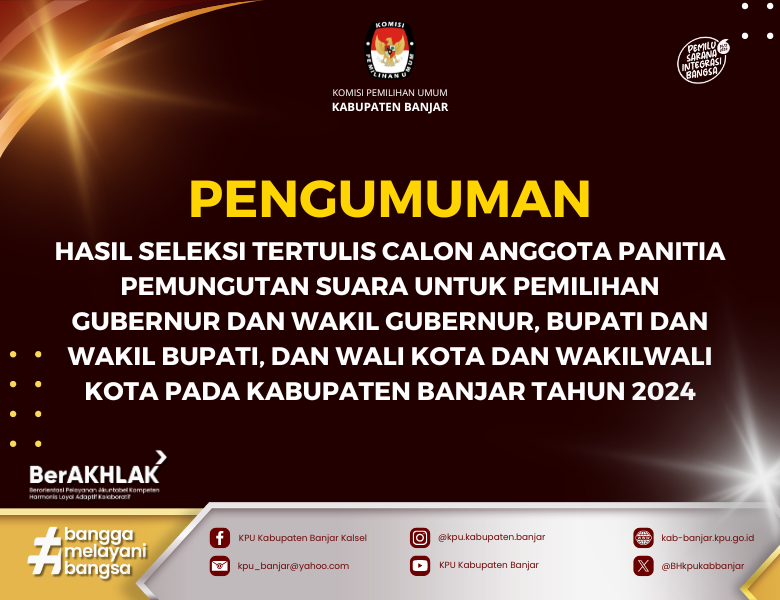 PENGUMUMAN TENTANG HASIL PENELITIAN ADMINISTRASI CALON ANGGOTA PANITIA PEMUNGUTAN SUARA UNTUK PEMILIHAN GUBERNUR DAN WAKIL GUBERNUR, BUPATI DAN WAKIL BUPATI KABUPATEN BANJAR TAHUN 2024 Selasa, 14 Mei 2024 23:59 500 DOWNLOAD PENGUMUMAN DISINI Baca Selengkapnya